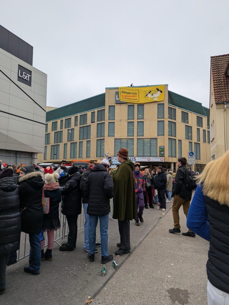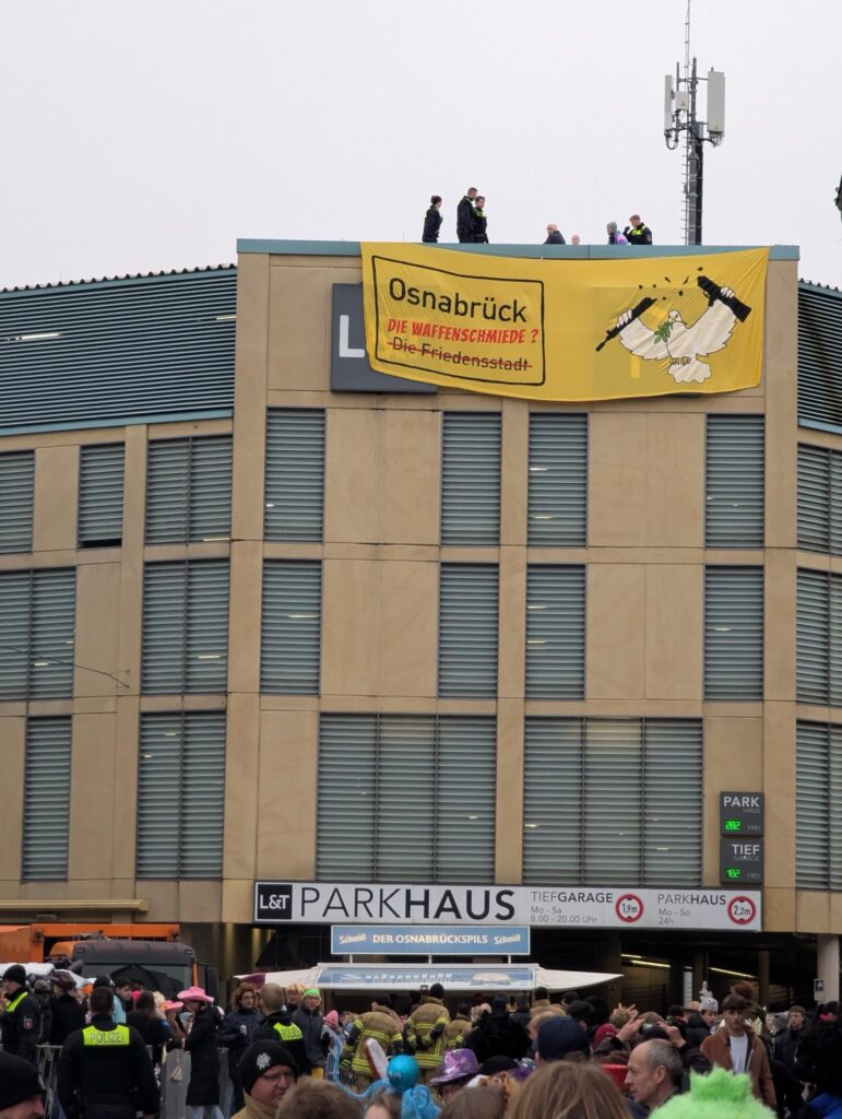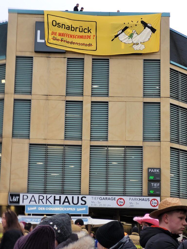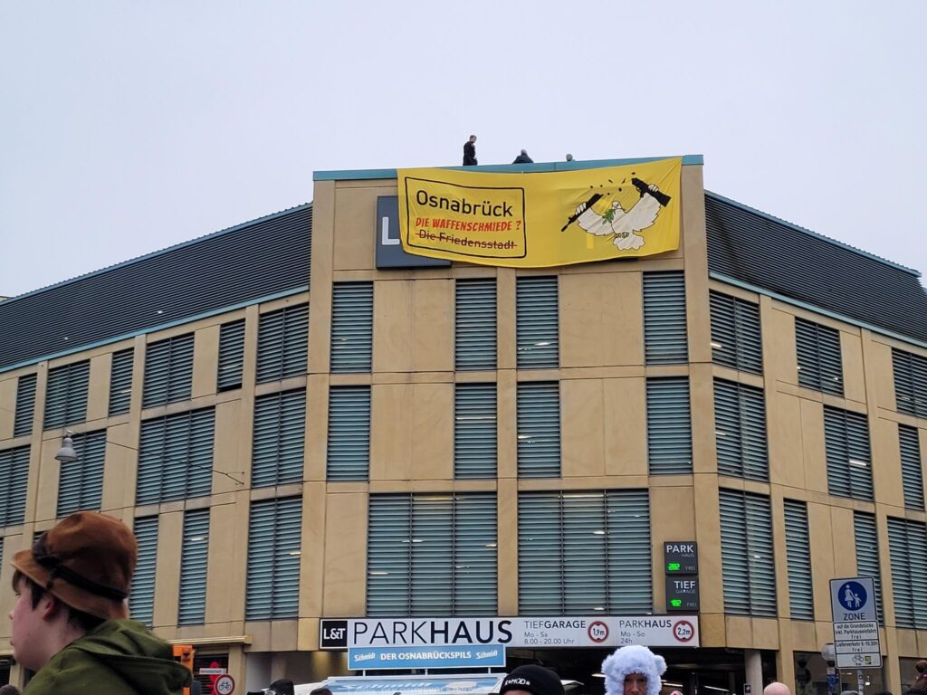 Am heutigen Samstag entrollten Antimilitarist*innen um 14:11, pünktlich zu Beginn des Ossensamstags-Umzugs ein großes Banner vom Dach des L&T-Parkhauses. Darauf zu lesen „Osnabrück – Die Waffenschmiede?“ sowie ein großes Bild einer Friedenstaube, die ein Gewehr durchbricht. Unten am Parkhauseingang wurden Plakate aufgestellt und geflyert. Die Aktion wurde nach etwa 20 Minuten polizeilicherseits beendet, die Personen sowie das Banner vom Dach entfernt.