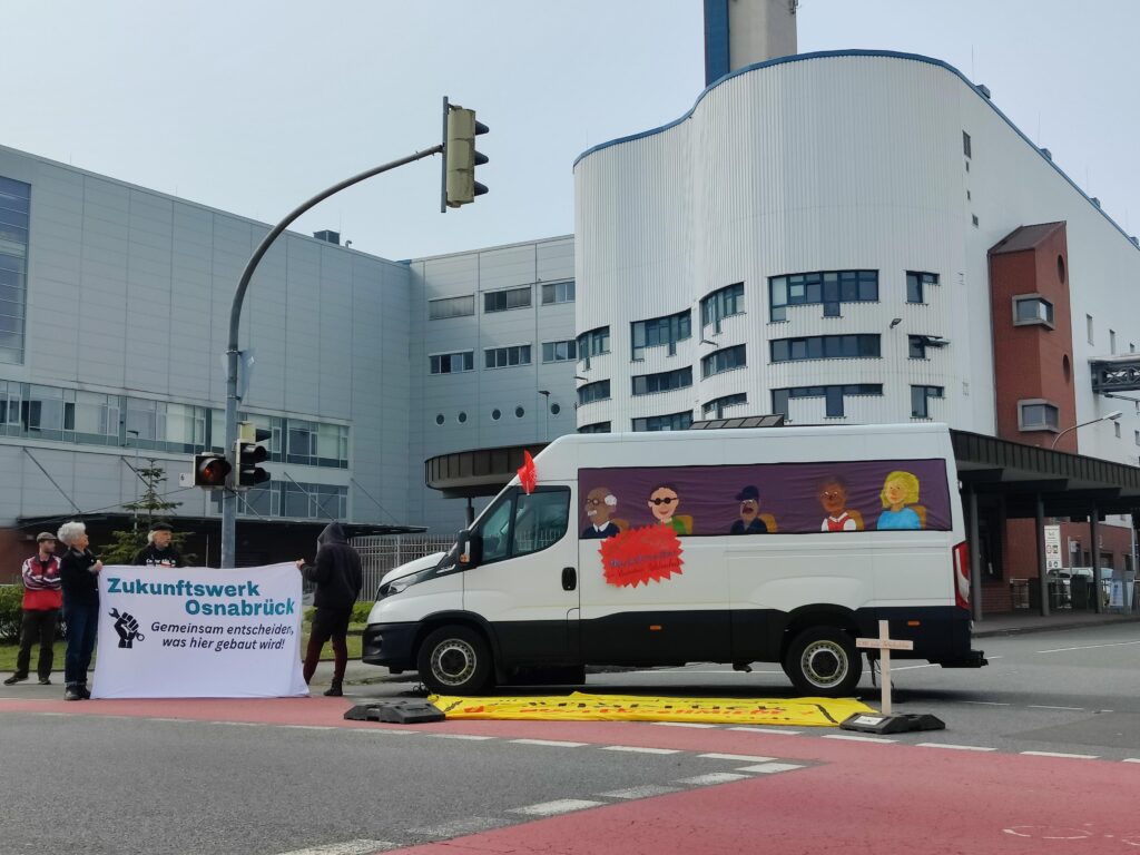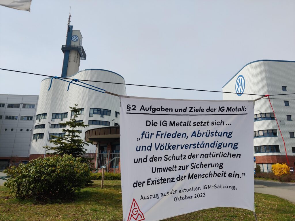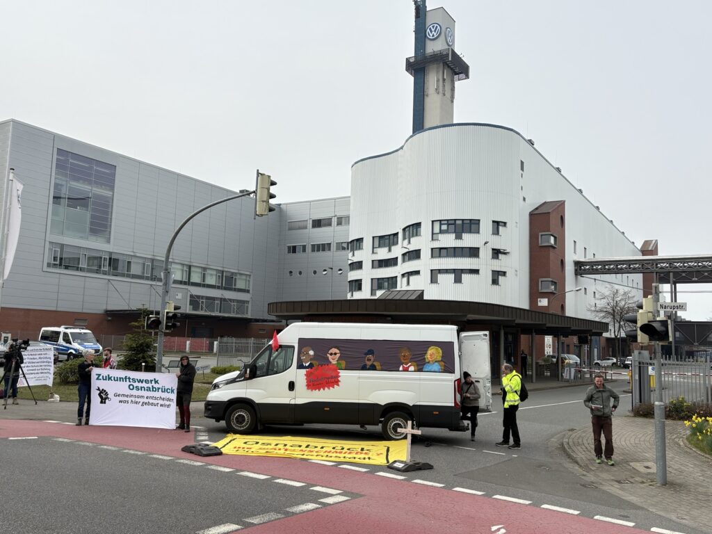 Am 24.03. um fünf vor 12 fand eine Kundgebung vor dem VW-Werk statt. Antimilitarist*innen stellten einen „Kleinbus“ vor die Werkstore, um für eine sozial-ökologische Konversion zu werben. Am selben Tag ging durch die internationale Presse die Nachricht, VW würde mit dem israelischen Raffael Defense Systems über die Produktion von Raketenträgern verhandeln. Die Militarisierung von Gesellschaft und Industrie ist völlig enthemmt, mittlerweile ist alles denkbar, kein Rüstungsdeal zu schmutzig, als dass nicht drüber verhandelt würde.